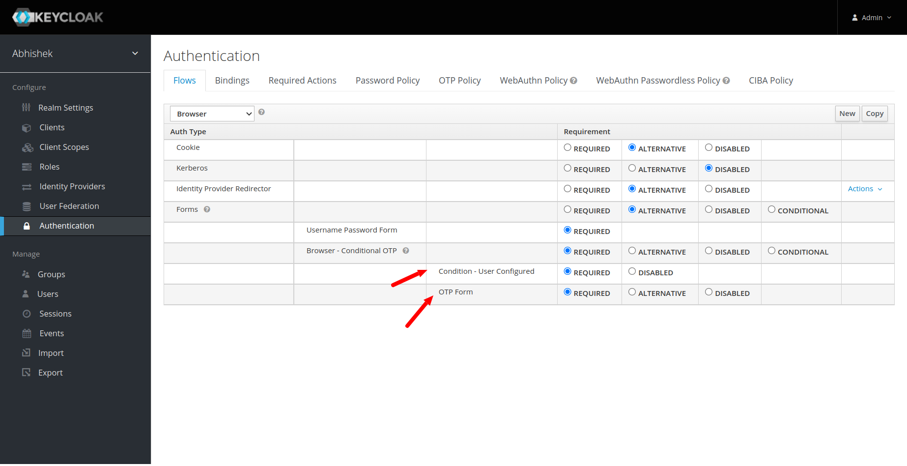 - This authentication checks to see whether Keycloak has set up additional processes for the user in the flow. Only when the user has an OTP credential setup does the