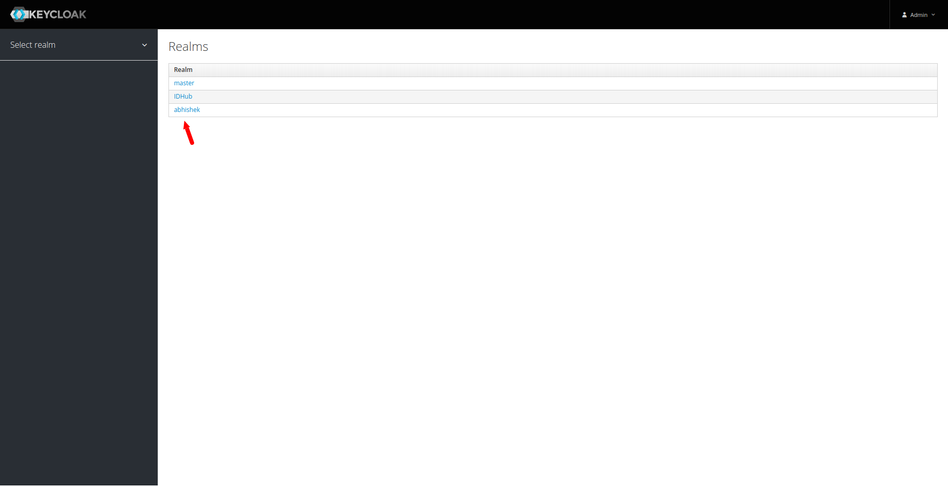 - Log into Keycloak Admin console using your Keycloak user name and password and select your realm.