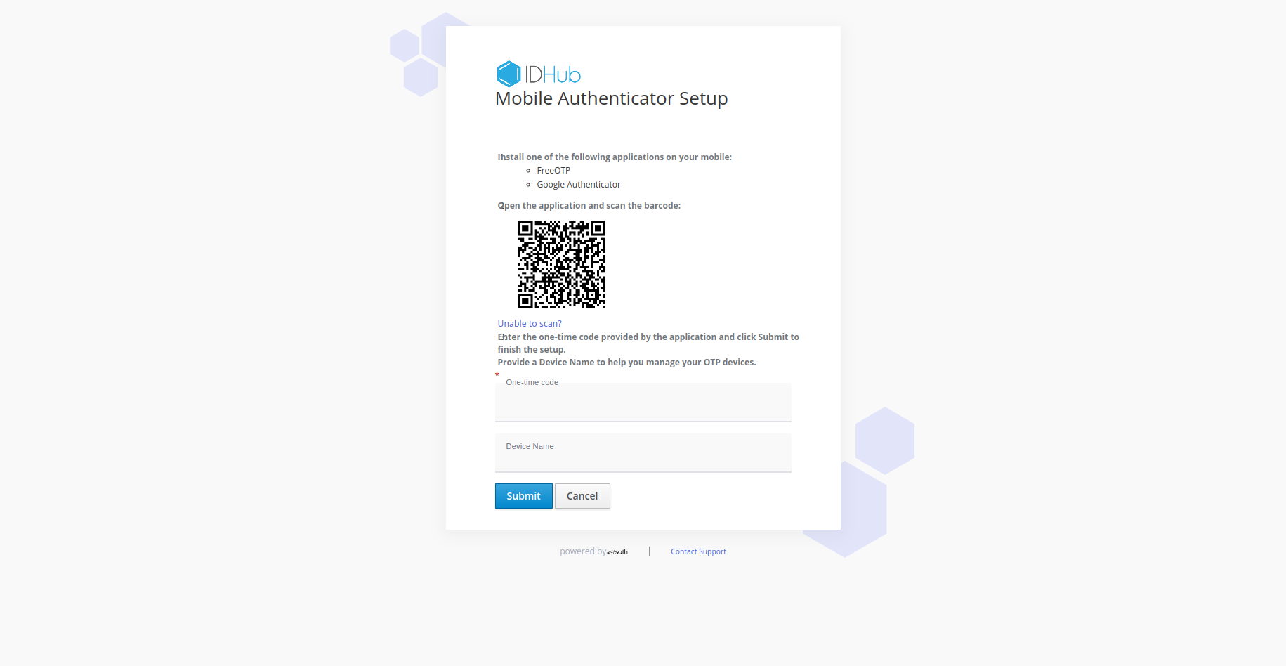 - After that, you will be shown the following page. Here you can use any Free authenticator app such as: Google Authenticator or FreeOTP to scan the bar code provided in the page.