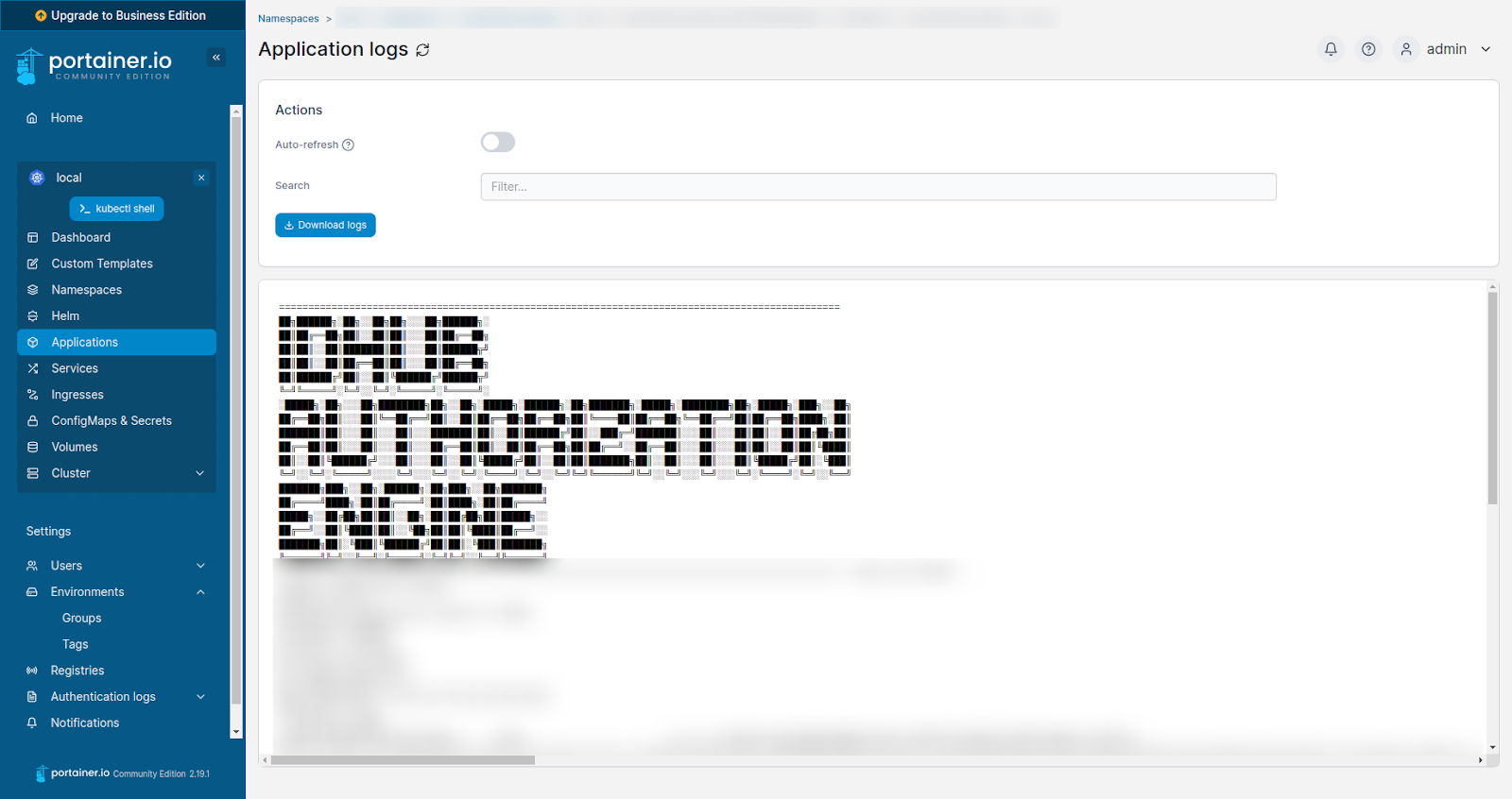 Click on one of the application and then under the application container sections, you will see Pods under that application. You can click on the logs button on one of them to see those logs.