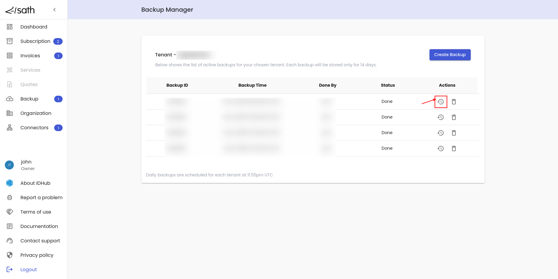 Create Backupbutton in order to create the backup for the tenant. A toast message will appear thatBackup Created Successfully. - IDHub creates the backup of the tenant and once the backup is completed, it will be added to the list of backups.