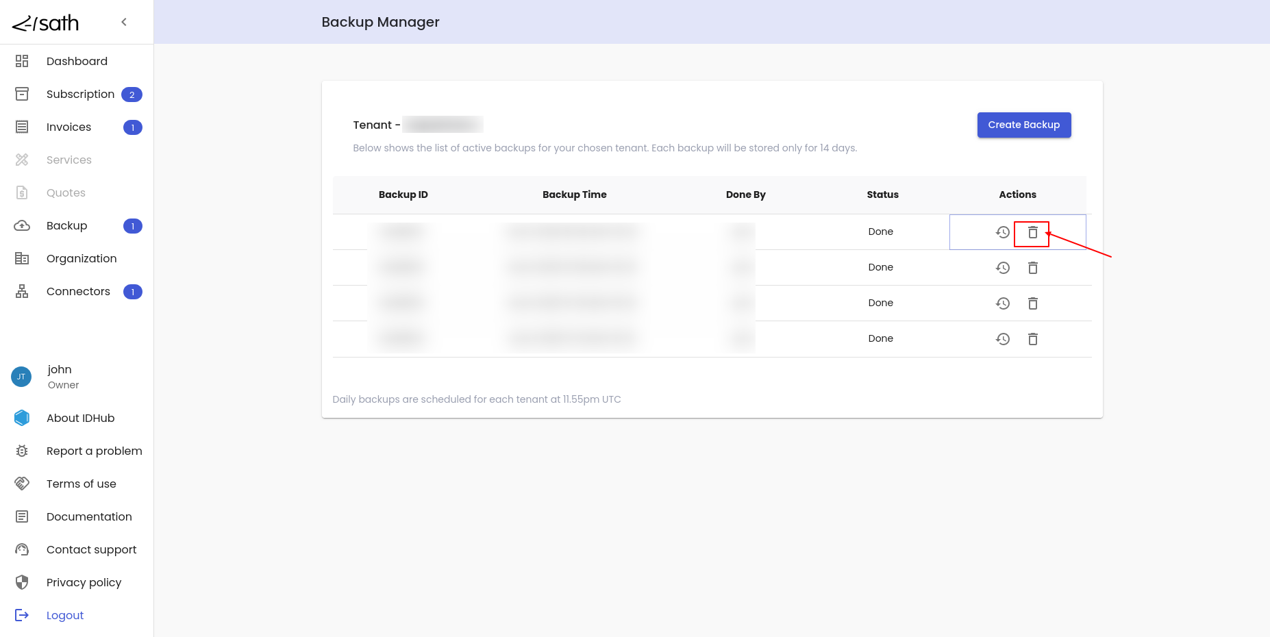 - IDHub would delete the backup and the backup list would be updated accordingly.