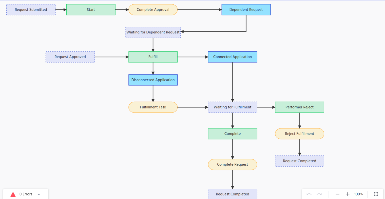• Request completed state node to denote that the request has been completed once the fulfiller has approved the request.